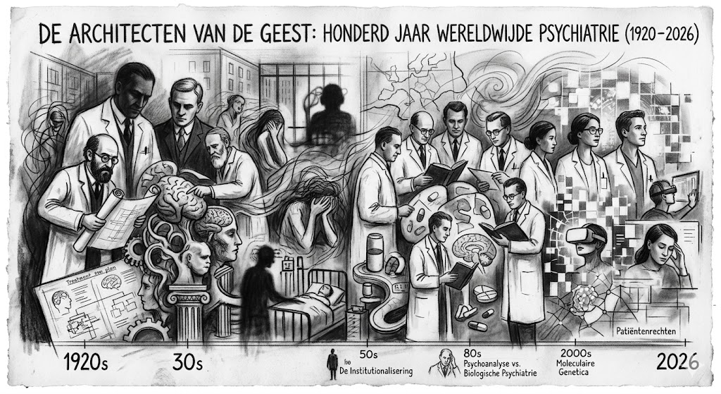 Wanneer we terugkijken op de afgelopen honderd jaar psychiatrie, zien we een vakgebied dat een spectaculaire reis heeft afgelegd van isolatie naar integratie. In de jaren '20 van de vorige eeuw was de psychiatrie nog grotendeels opgesloten achter de muren van grote asielen, waar pioniers als Kraepelin probeerden orde te scheppen in de schijnbare chaos van de menselijke waanzin. De patiënt was destijds vaak een object van observatie. Vandaag, in 2026, is de psychiatrie een dynamisch veld waarin de patiënt een actieve partner is in een hoogtechnologisch en diepmenselijk herstelproces.